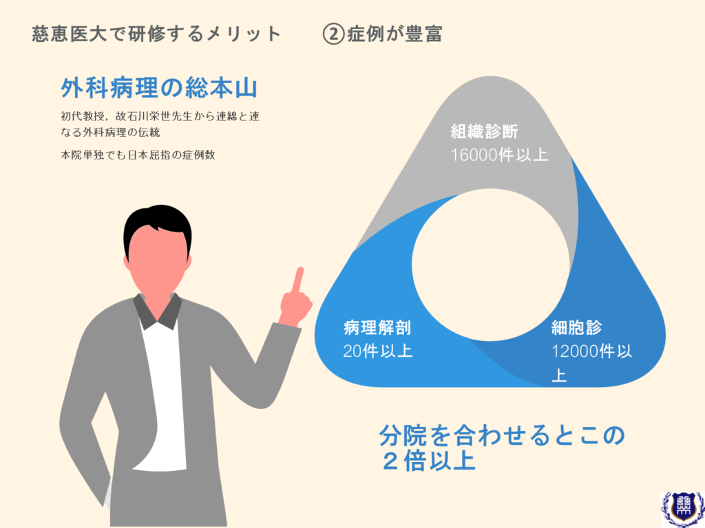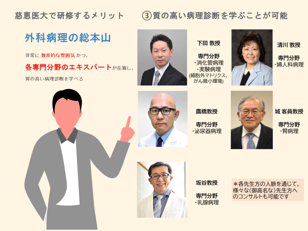 東京慈恵会医科大学附属病院 病院病理部を基幹施設とする専門研修プログラムの特色は、以下の通りである。当施設においては、多数の専門領域をカバーする指導医を有している点と、基幹病院・関連病院をふくめて豊富な症例数を有している点から、多彩かつ偏りのない症例を無理なく経験できることが、最も特色ある点である。また、質・人数ともに指導医が充実していることから、各症例について専門的かつ最新の知識を得ることが可能である。したがって、豊富な症例と充実した指導から、各専攻医に対して、病理専門医としての基礎的な能力を十分に習得させることを目標としている。また、当病院病理